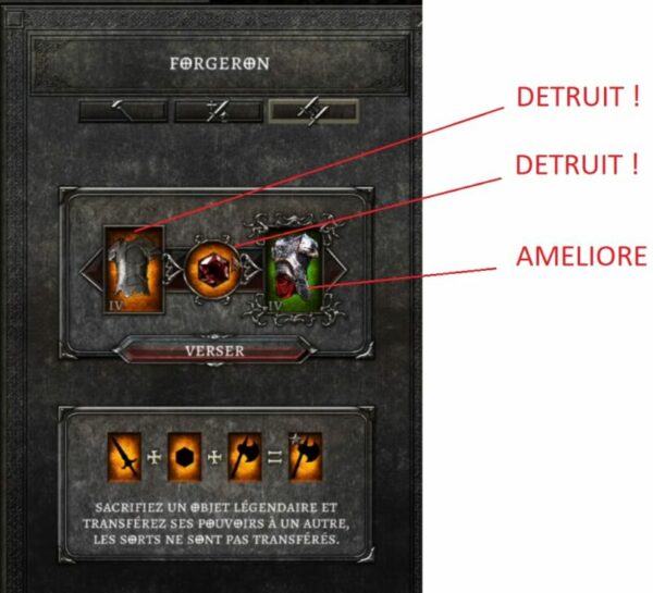 Activité extrêmement couteuse mais très rentable, vous récupérez toutes statistiques d'un légendaire pour les mettre sur un autre. Evidemment cela à un cout et nécessitera d'utiliser un coeur de l'infusion et un gros paquet d'or (2,5 millions). Du coup faites très attention à l'objet que vous souhaitez améliorer, et faites le sur au moins du Tiers V ! Pour mon cas c'était pour l'exemple que je l'ai fait sur du Tiers IV. Vous débloquerez cette fonctionnalité du forgeron avec les quêtes du mode histoire.