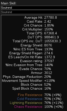 Soulrend est un build chaos, et qui plus est, un build DOT (damage over time), donc les principales stats à prioriser sont les chaos damage, les chaos damage over time multiplier, et les damage over time multiplier, les spells damage peuvent également être ajouté au build, mais ce n'est qu'un bonus comparé aux 3 autres stats citées avant. Les items ayant du "nearby ennemies have -9% chaos resistances" augmentent les dégâts, mais coutent également cher.