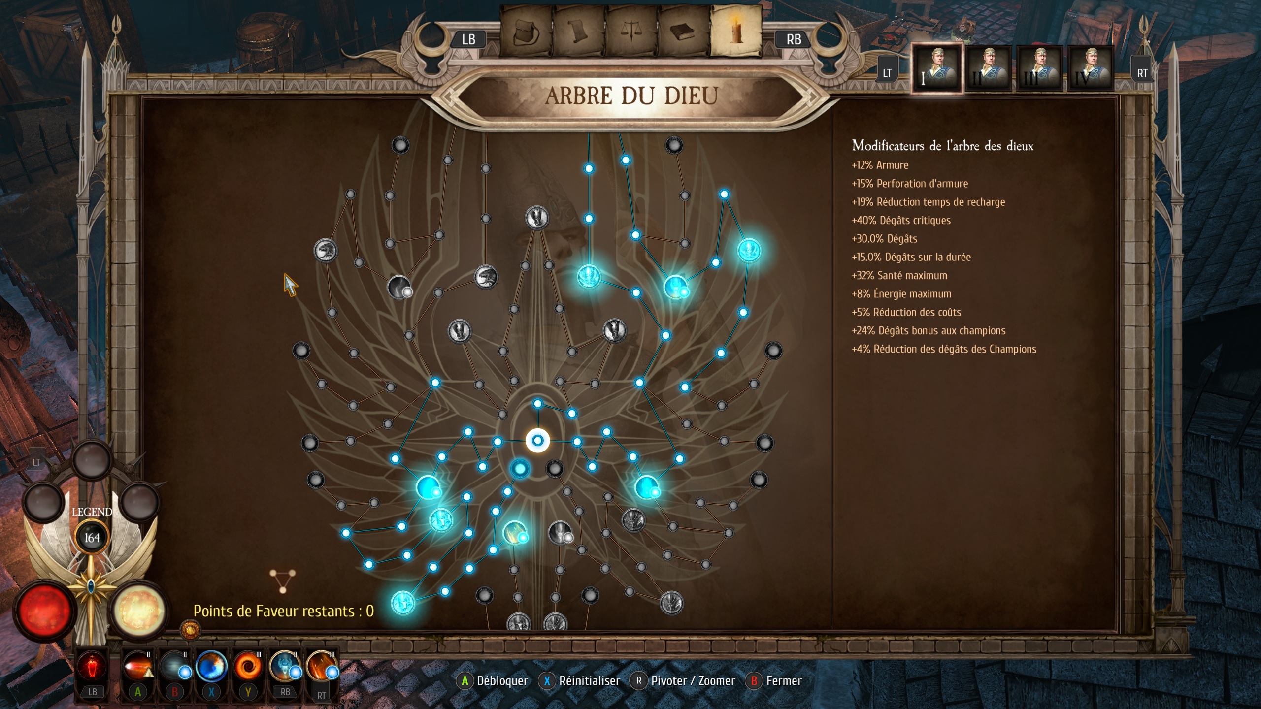 Prenez les trois compétences des dieux avec l'arbre suivant, deux actifs et un passif :